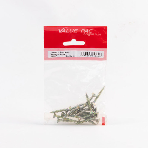 The Value Pack 5mm x 30mm ZYP Multi Purpose Screws are versatile fasteners designed for various home improvement applications. This convenient pack of 18 zinc-plated countersunk pozi screws provides excellent value for money and is perfect for general-purpose fixing needs around the home. The single thread design and countersunk head ensure a clean, flush finish in your projects.