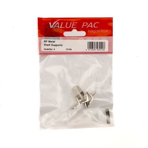 The Value Pack Nickel Plated Metal Shelf Supports include 4 sturdy metal pins designed to provide reliable support for adjustable shelving systems. These essential hardware components feature a professional nickel-plated finish that offers both durability and a clean, modern appearance. Part of the Value Pack range of over 500 home essential items, these shelf supports deliver both quality and value for money.