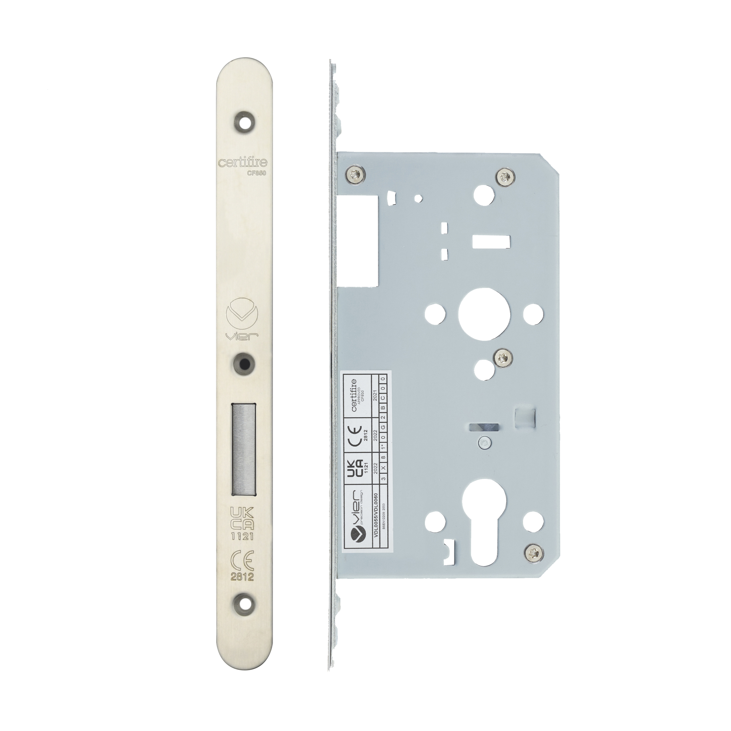The VIER DOOR HARDWARE Din Euro Deadlock features a robust 90mm case with 60mm backset, designed for reliable security in residential and commercial applications. This high-quality lock incorporates a Grade 304 stainless steel two-piece radius forend (22mm profile) with a stainless steel double throw deadbolt for enhanced durability and corrosion resistance. The mechanism includes a grip tight follower and is certified to BS EN 12209:2003 Grade 3 standards, ensuring excellent performance and longevity. With its satin stainless steel finish and 72mm centre-to-centre fixing, this deadlock provides both aesthetic appeal and professional-grade security.