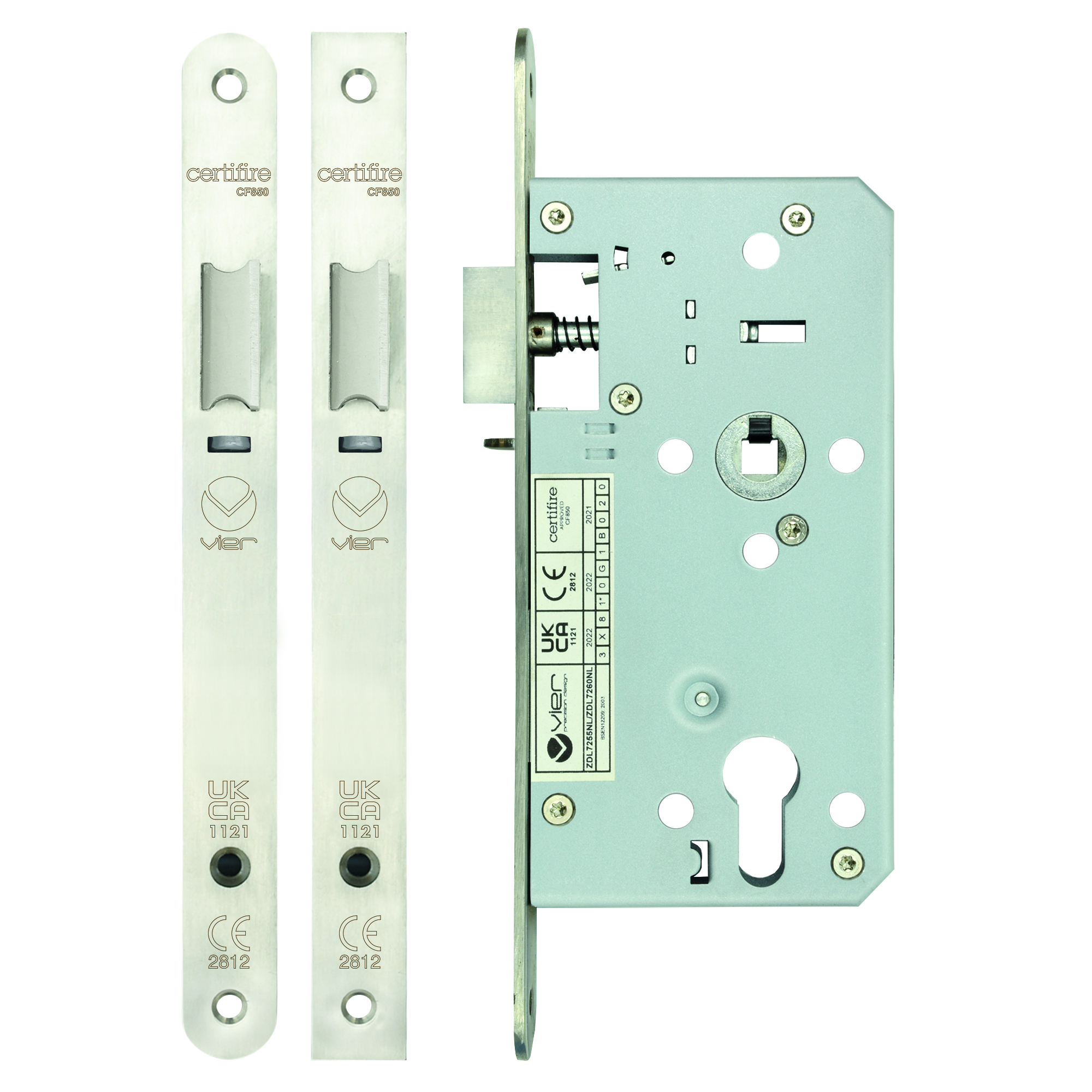 The VIER DOOR HARDWARE DIN Night Latch 72mm c/c Backset 55mm Radius Satin Stainless is a high-quality lock mechanism featuring Grade 304 stainless steel construction for both the forend and latchbolt, ensuring excellent durability and corrosion resistance. This professional-grade lock includes an anti-thrust pin for enhanced security and a grip tight follower for reliable operation. With an 85mm case size, 55mm backset, and 22mm square profile, it meets BS EN 12209:2003 Grade 3 standards for cycle and durability testing. The satin stainless finish provides a contemporary aesthetic that complements modern door hardware, while the robust construction ensures long-lasting performance in residential and commercial applications.