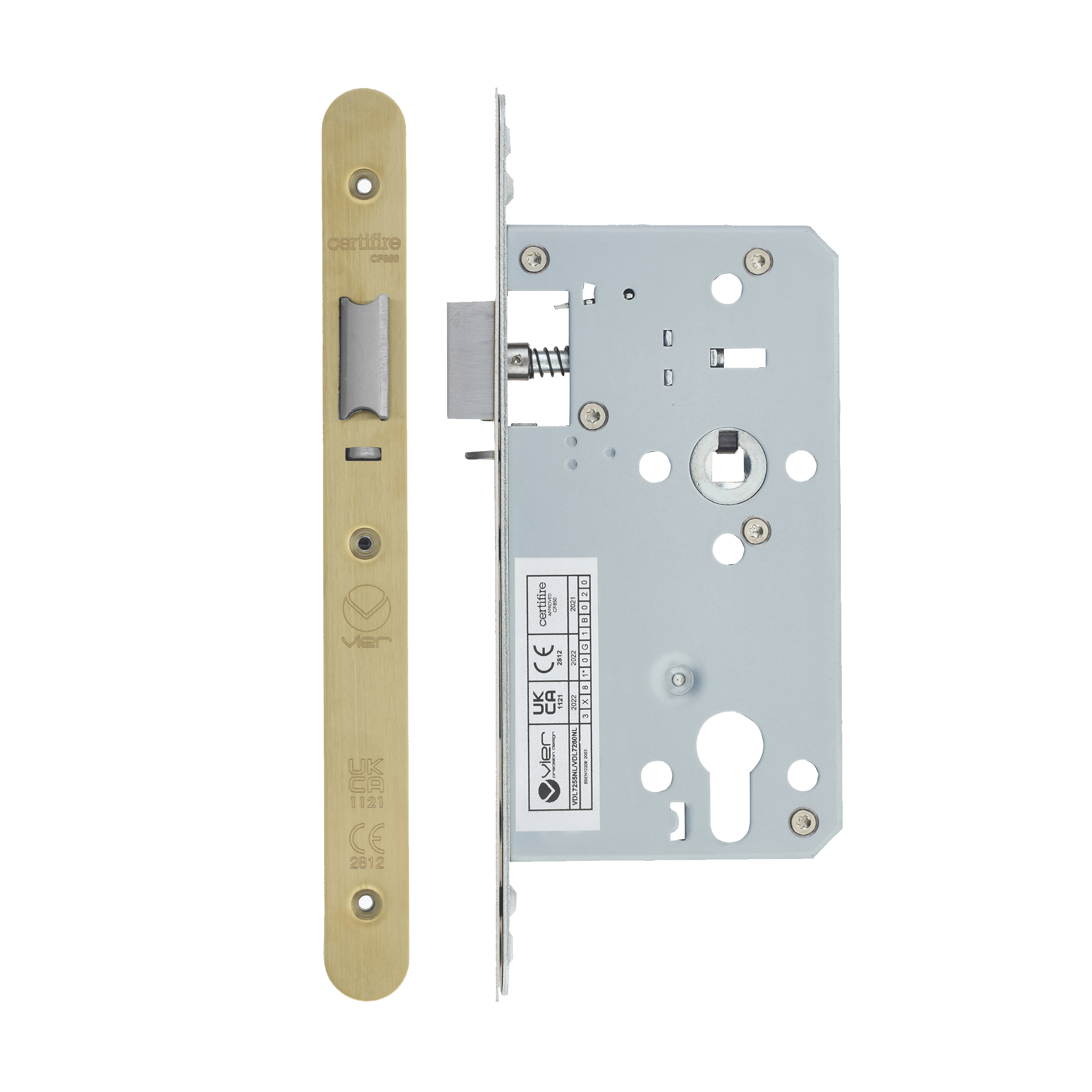 The VIER DOOR HARDWARE DIN Nightlatch features a robust 90mm case with 60mm backset, designed for reliable door security and smooth operation. This high-quality lock mechanism includes a Grade 304 stainless steel two-piece radius forend (22mm profile) and latchbolt, complemented by an attractive PVD satin brass effect faceplate. Enhanced security features include an anti-thrust pin and grip-tight follower for superior protection. The lock is certified to BS EN 12209:2003 Grade 3 standard, ensuring durability through rigorous cycle and performance testing. With 72mm centre-to-centre measurements and professional-grade construction combining stainless steel internals with a premium brass-effect finish, this nightlatch offers both aesthetic appeal and dependable performance for residential and commercial applications.