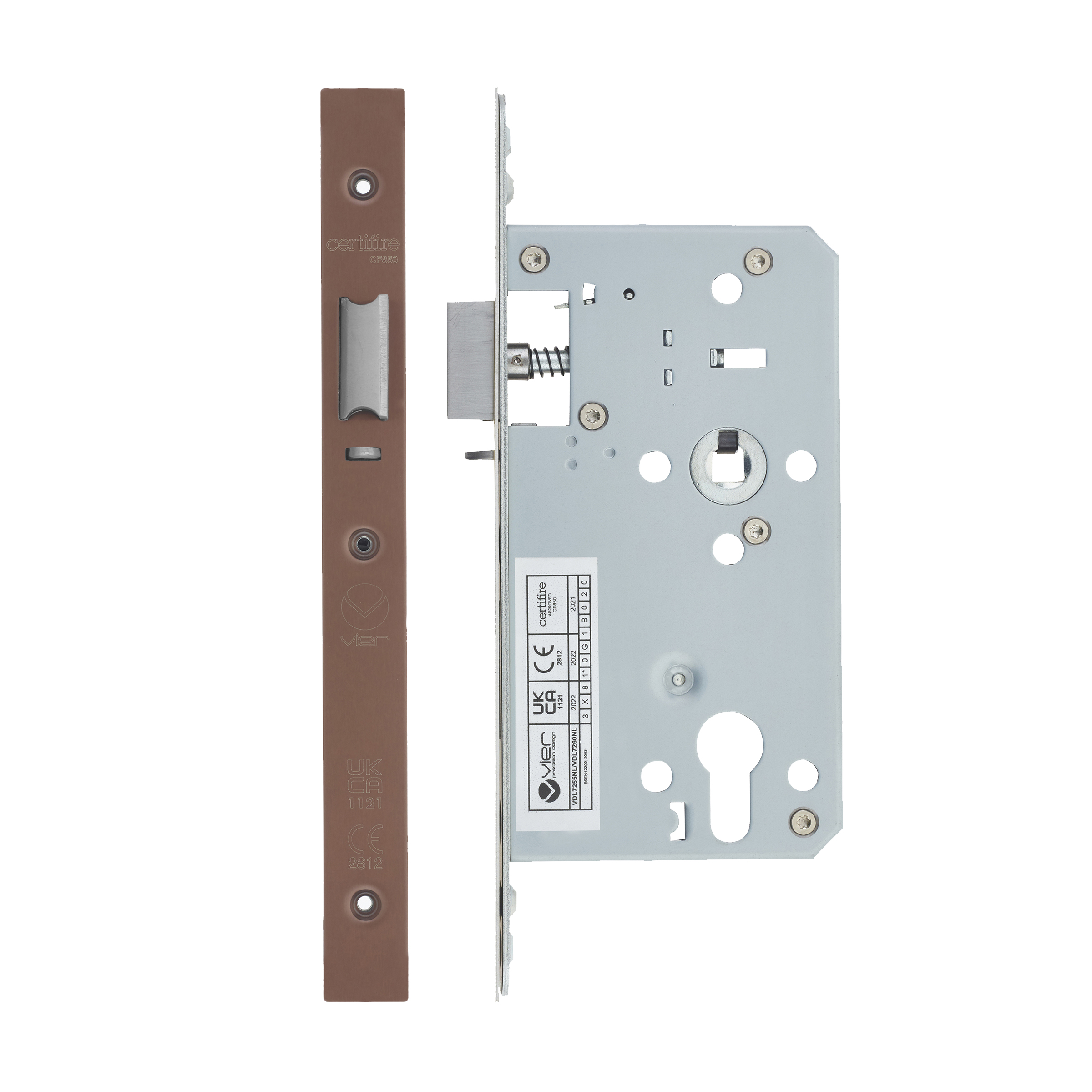 The VIER DOOR HARDWARE Din Nightlatch features a robust 90mm case with 60mm backset, designed for reliable door security. This high-quality lock mechanism includes a Grade 304 stainless steel two-piece square forend (22mm profile) with a premium PVD satin bronze effect finish, complemented by stainless steel latchbolt and deadbolt. Key features include a double throw deadbolt for enhanced security, anti-rattle strike for quiet operation, and grip tight follower for smooth functionality. BS EN 12209:2003 Grade 3 certified, this nightlatch offers professional-grade performance with 72mm centre-to-centre measurements, making it ideal for both residential and commercial door applications.