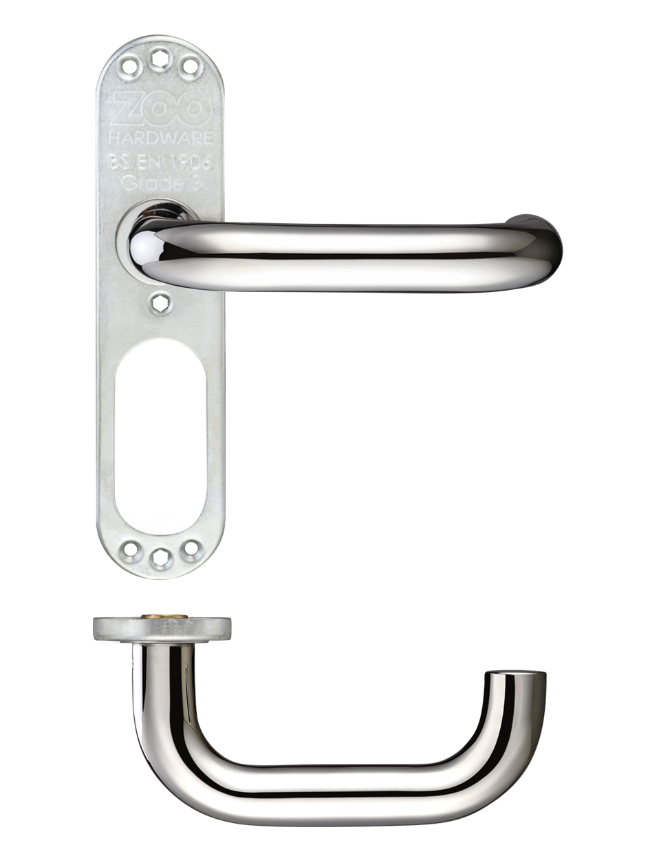 The ZOO DOOR HARDWARE 19mm Tubular Return to Door Lever on Inner Plate includes a contemporary polished stainless steel lever handle mounted on a short backplate with integrated return-to-door functionality. Manufactured from premium SS Grade 304 stainless steel, this handle set is certified to BS EN 1906:2010 Grade 3 and BS EN 1634-1, with fire testing for 30 and 60 minute timber doors. The 178 x 43mm backplate design complies with BS8300 accessibility requirements, making it suitable for commercial and residential applications. The kit includes all necessary fixings: M4 male/female fixings, M6 Heso grub screws, wood screws, and a spindle for complete installation.