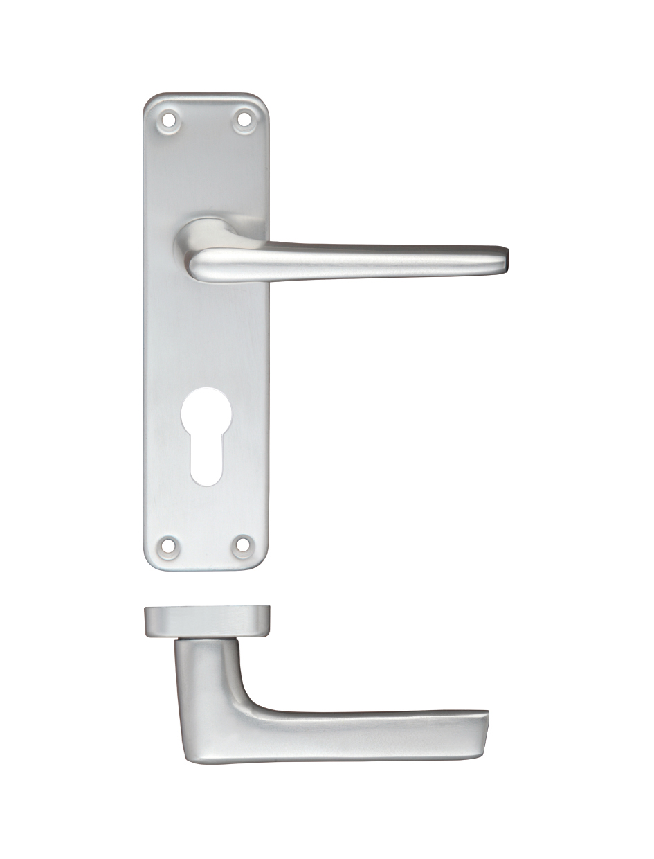 The ZOO DOOR HARDWARE Contract Aluminium Lever on Europrofile Backplate includes a pair of contemporary lever handles with a satin aluminium finish, designed for use with euro profile cylinders. The lever is circlip fixed to the backplate for secure installation, with 47.5mm centre-to-centre fixing holes. This handle set is certified to BS EN 1634-1 standards, ensuring reliable performance and durability for commercial and residential applications.