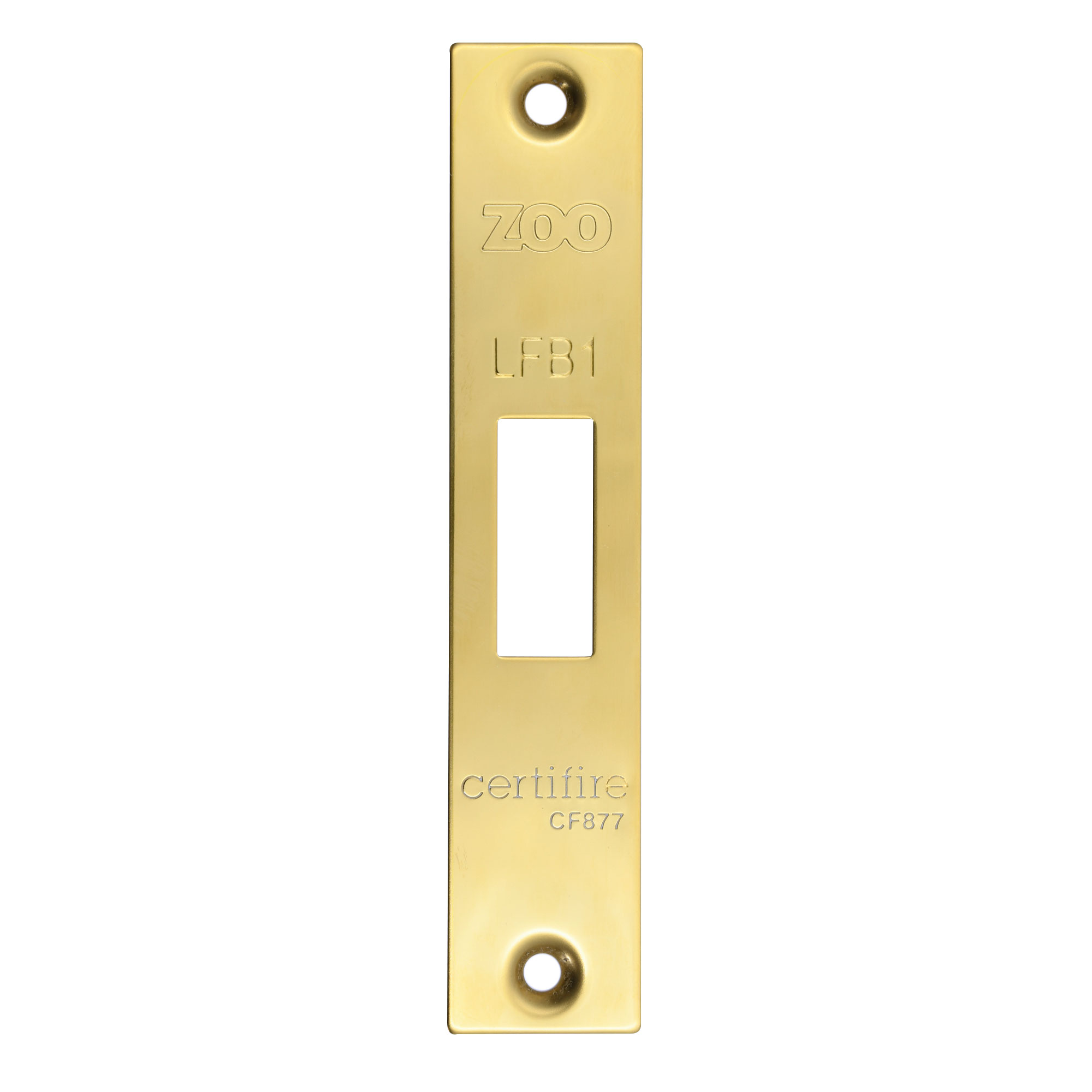 The ZOO LOCKS & LATCHES Square Forend, Strike and Escutcheon Pack is designed specifically for use with the ZFB01 Fire Brigade Lock. Finished in a premium PVD polished brass coating, this component provides a durable and attractive brass finish that resists tarnishing and wear. The forend plate features the distinctive ZOO branding and LFB1 marking, along with Certifire certification (CF877), ensuring compliance with fire safety standards. The rectangular cutout accommodates the lock mechanism, while mounting holes at top and bottom enable secure installation. This high-quality component is ideal for fire-rated door applications where both functionality and aesthetic appeal are important.