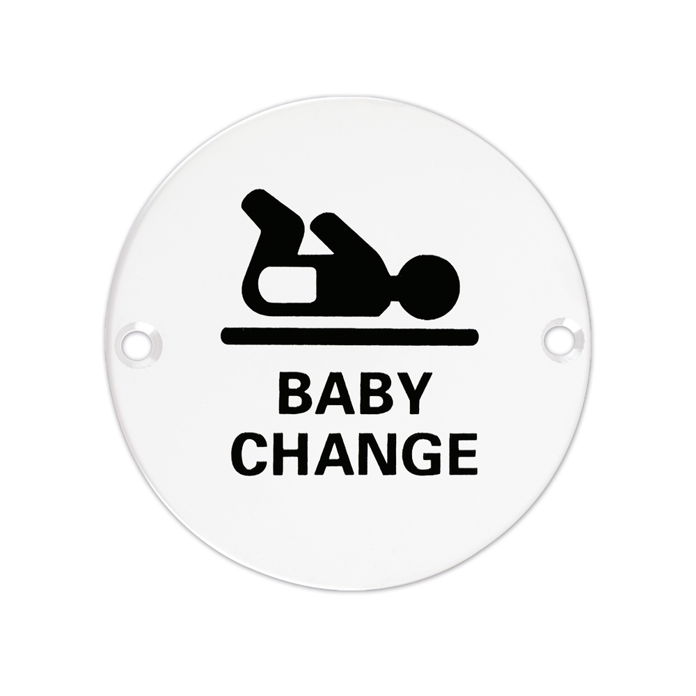 The ZOO SIGNAGE Baby Change sign provides clear, professional identification for baby changing facilities. This 76mm diameter circular sign features a high-contrast black baby change symbol on a powder coated matt white background, ensuring excellent visibility. Manufactured from durable stainless steel with face-fix mounting holes, this sign offers long-lasting performance and easy installation. The sign is certified to BS EN 1634-1 standards, demonstrating quality and reliability. Ideal for public restrooms, retail facilities, restaurants, and any commercial space requiring clear baby changing facility identification.