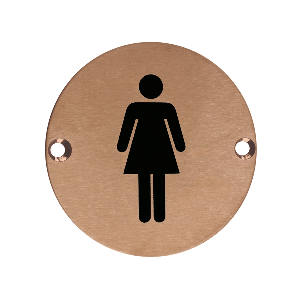 The ZOO SIGNAGE Sex Symbol – Female – 76mm Dia PVD Bronze is a premium quality toilet signage plate featuring a clear black female symbol on a brushed bronze finish. This face-fix signage is manufactured from stainless steel with a durable PVD bronze coating, providing excellent corrosion resistance and longevity. The 76mm diameter circular plate includes pre-drilled mounting holes for secure installation and meets BS EN 1634-1 standards, making it suitable for professional commercial and public facility applications where clear, elegant washroom identification is required.