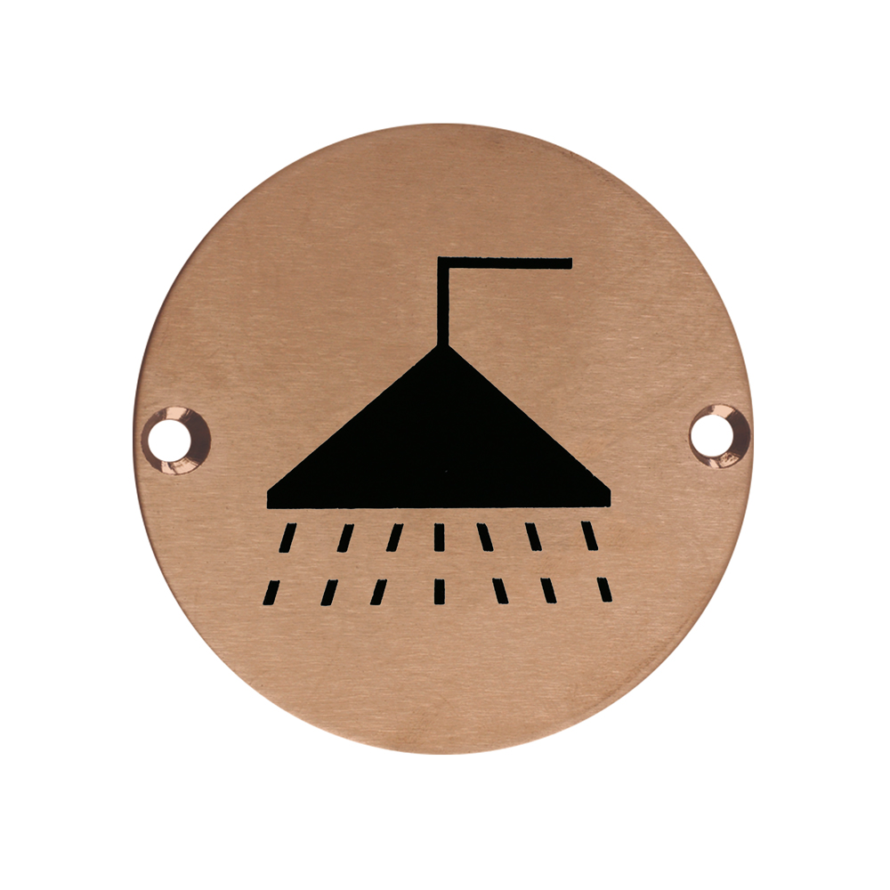 The ZOO SIGNAGE Sex Symbol Shower 76mm Dia PVD Bronze is a premium quality shower facility sign featuring a contemporary brushed bronze finish. This face-fix circular disc displays a clear shower symbol with water droplets, making it ideal for identifying shower facilities in commercial, hospitality, and public buildings. Manufactured from durable stainless steel with a PVD bronze coating for long-lasting performance and corrosion resistance, this 76mm diameter sign includes mounting screws for easy installation. The sign meets BS EN 1634-1 standards, ensuring quality and reliability for professional applications.